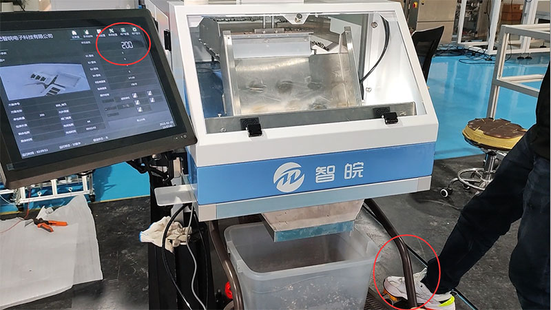 此小零件自動(dòng)視覺計(jì)數(shù)機(jī)客戶是緊固件生產(chǎn)商,采購小零件視覺計(jì)數(shù)機(jī)主要用于包裝環(huán)節(jié),需要計(jì)數(shù)和分包功能,因?yàn)樗俣纫蟛桓撸圆捎萌斯そ恿戏绞酱钆淠_踏控制開關(guān)。