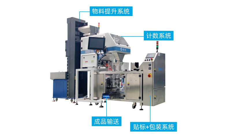 可定制整套計數(shù)包裝系統(tǒng):物料提升系統(tǒng)-計數(shù)系統(tǒng)-貼標系統(tǒng)-包裝系統(tǒng)-成品輸送系統(tǒng)